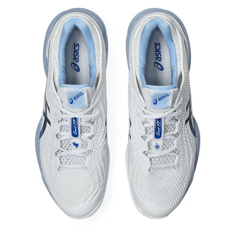Las Asics Court FF 3 Novak fueron desarrolladas en colaboración con Novak Djokovic, combinando rendimiento de élite, estabilidad superior y un diseño impactante en blanco con detalles azul tuna.